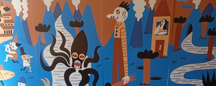 Un miriorama és un conjunt de targetes il·lustrades que es poden reordenar formant diferent paisatges i creant noves històries. Eren molt populars durant el segle XIX, agradaven molt als infants de l’època i hi jugaven moltíssim. La il·lustradora Blanca Hernàndez ha dibuixat uns miriorames gegants plens de personatges i éssers fantàstics propis de la rondallística catalana.